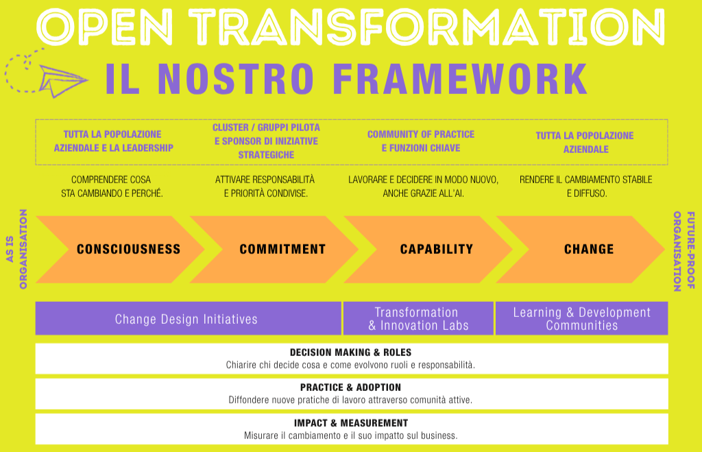 La Open Transformation è il nostro modo di accompagnare questo passaggio. Un processo continuo, strutturato in wave iterative che combinano assessment, apprendimento, sperimentazione nella pratica lavorativa quotidiana attraverso progettualità ad hoc.